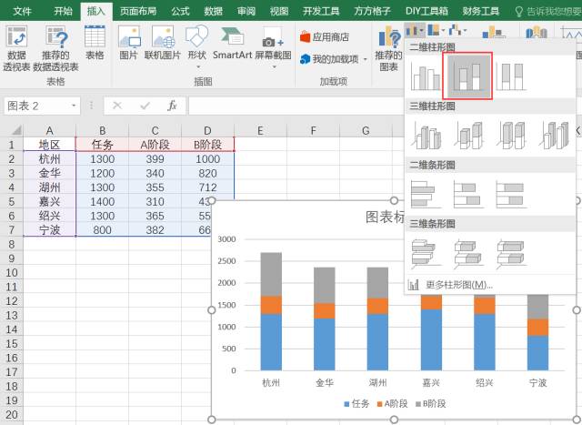 选择数据源,然后选择插入二维堆积柱形图,操作如所示: